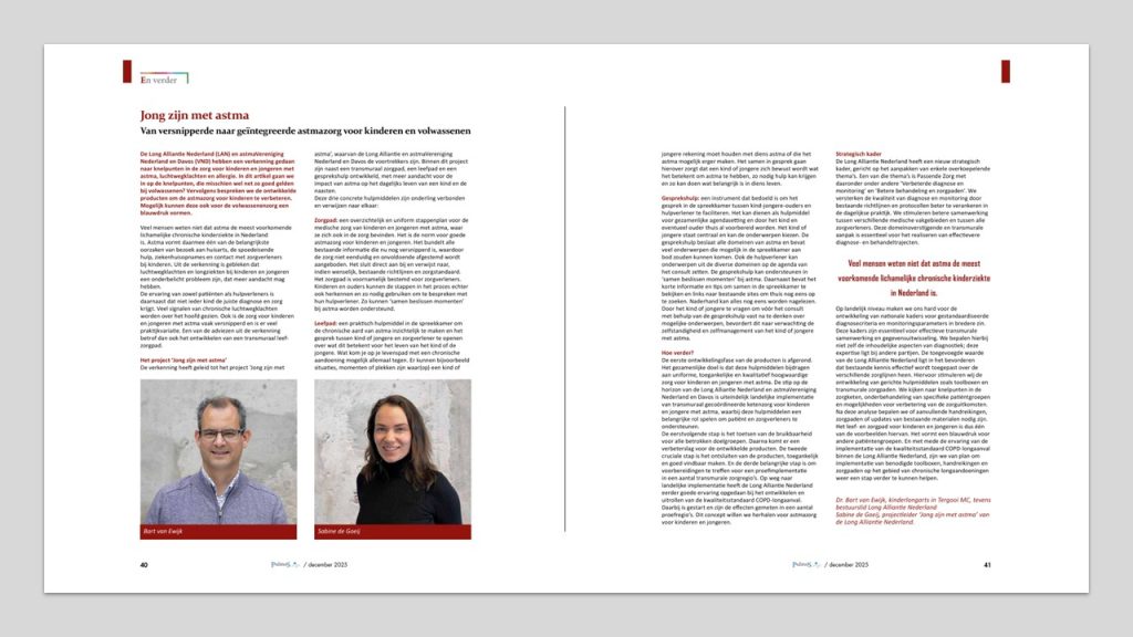 De eerstvolgende stap is het toetsen van de bruikbaarheid voor alle betrokken doelgroepen. Daarna komt er een verbeterslag voor de ontwikkelde producten. De tweede cruciale stap is het ontsluiten van de producten – toegankelijk en goed vindbaar maken. En de derde belangrijke stap is om voorbereidingen te treffen voor een proefimplementatie in een aantal transmurale zorgregio’s. Op weg naar landelijke implementatie heeft de Long Alliantie Nederland eerder goede ervaring opgedaan bij het ontwikkelen en uitrollen van de kwaliteitsstandaard COPD-longaanval. Daarbij is gestart en zijn de effecten gemeten in een aantal proefregio’s. Dit concept willen we herhalen voor astmazorg voor kinderen en jongeren.