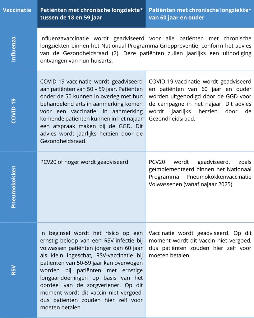 Tabel met het advies uit de leidraad vaccinaties bij longziekte